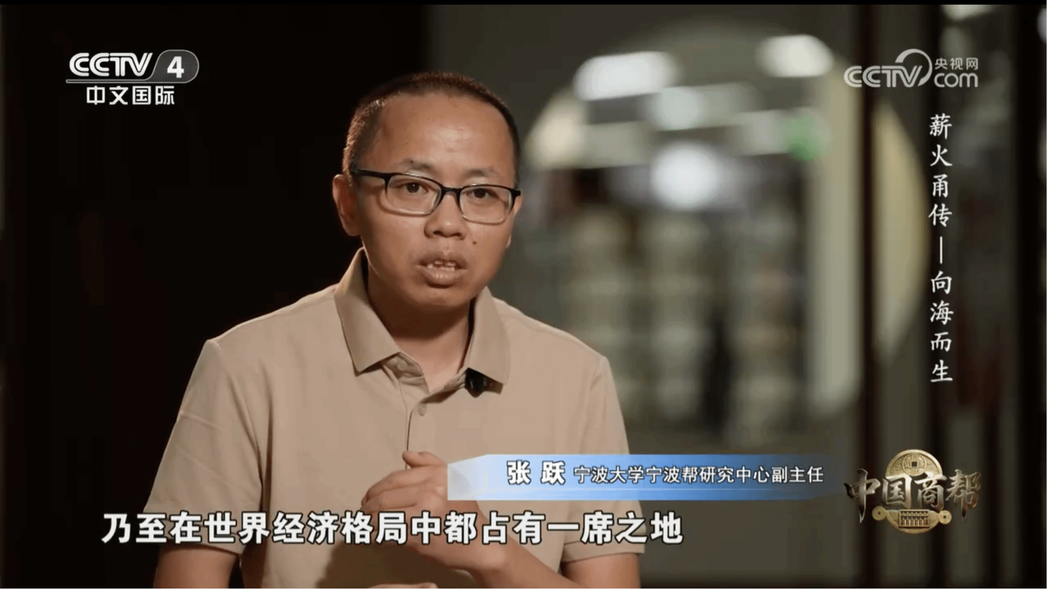 近日,由中央广播电视总台与中共宁波市委宣传部联合打造的大型系列纪录片《中国商帮之薪火甬传》在CCTV-4中文国际频道播出。电竞博彩张跃副教授受邀参与节目录制,并在第一集《向海而生》中出镜接受采访。